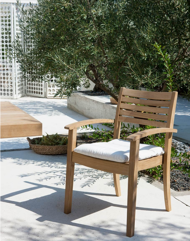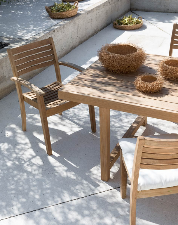 With its simple design, it fits perfectly with all teak tables and blends into any ambience. It is also available without armrests.