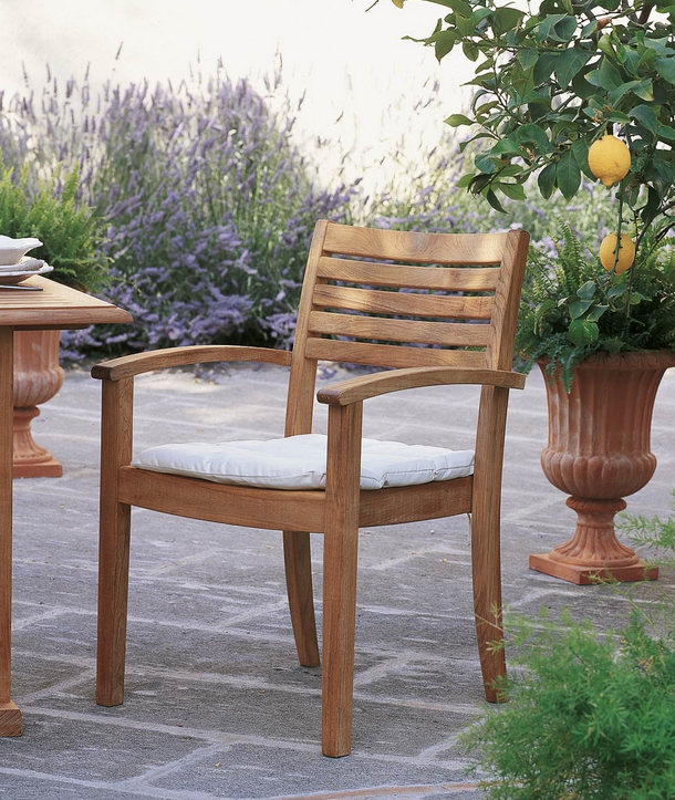 The comfortable CHELSEA armchair is the only stackable teak armchair in the catalogue.