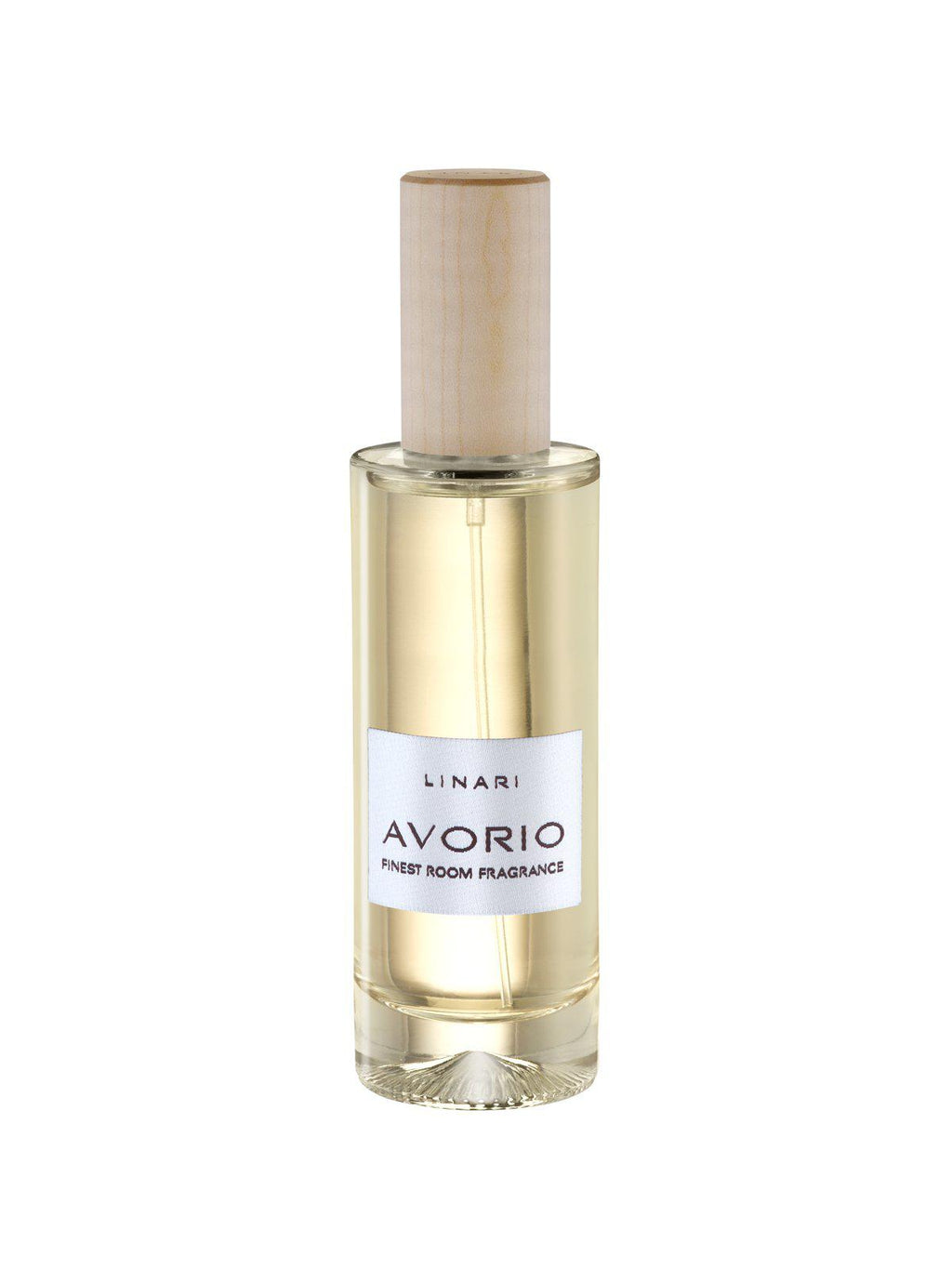 The LINARI-AVORIO room spray comes in an Italian clear glass bottle with a fine maple wood lid and a high-quality satin label.