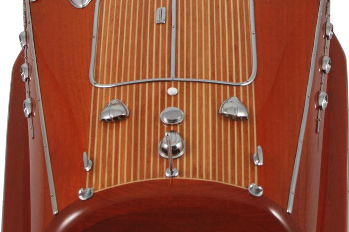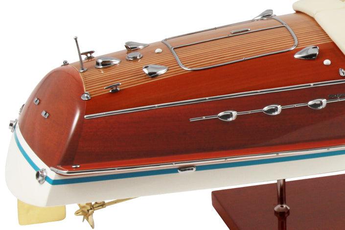This official Rivs Super Ariston model boat (1:10 scale) is made of wood and polyester fiberglass with matching parts (chrome brass) built by our jewelers. Real padding.