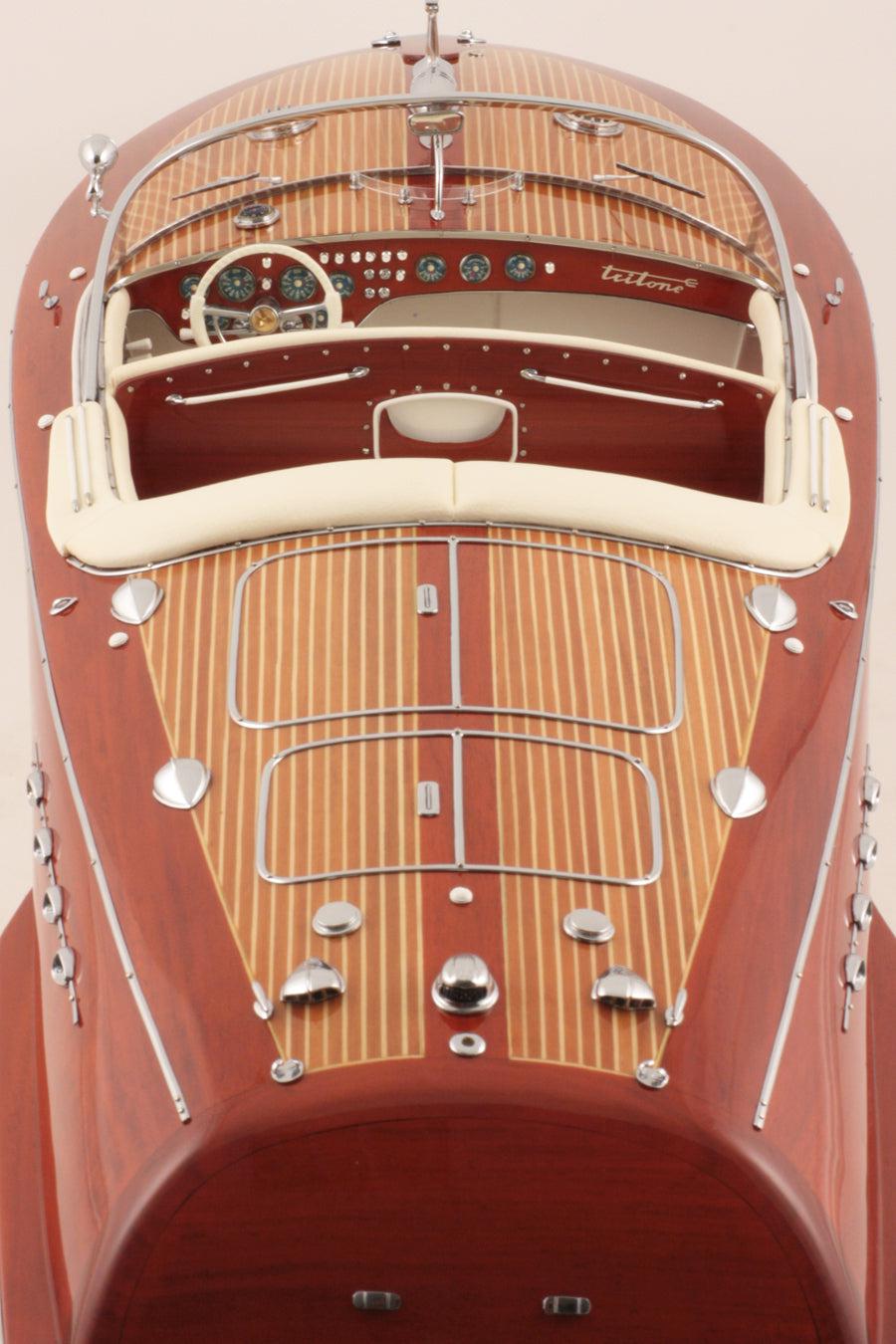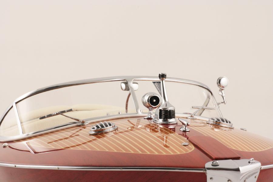 This official Riva Super Tritone model boat (1:10 scale) is built by our jewelers using high quality wood (beech wood) and matching parts (chrome brass). Real padding.
