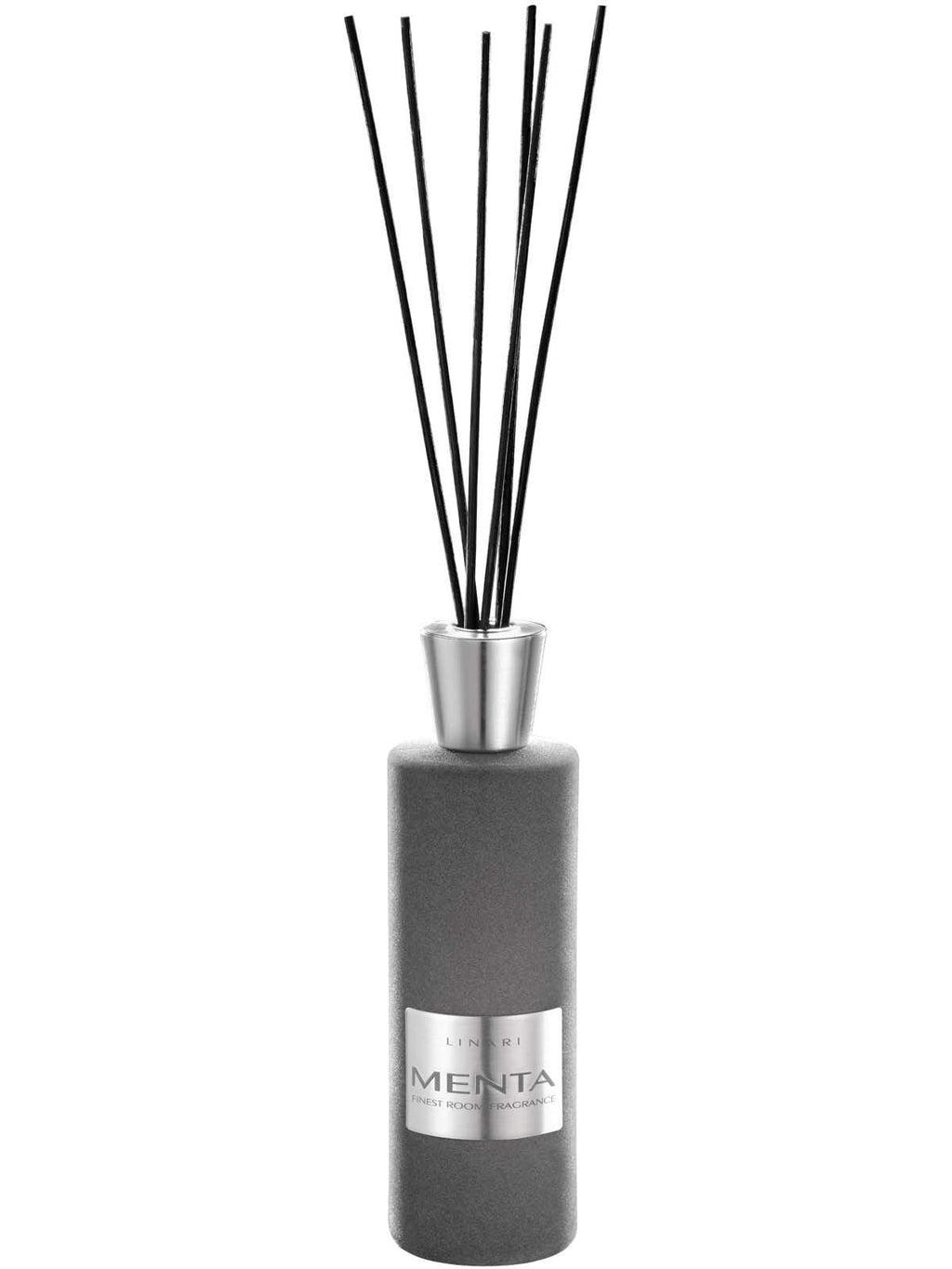 The LINARI-MENTA diffuser comes with exclusive black capillary rods in a unique flacon made of Italian glass, which is lined with the finest grey-mélange velvet, the lid and label have high-quality brushed aluminum surfaces. The use of velvet and aluminum, materials otherwise predominantly used in the interior area, elegantly symbolizes the interface between space and fragrance.