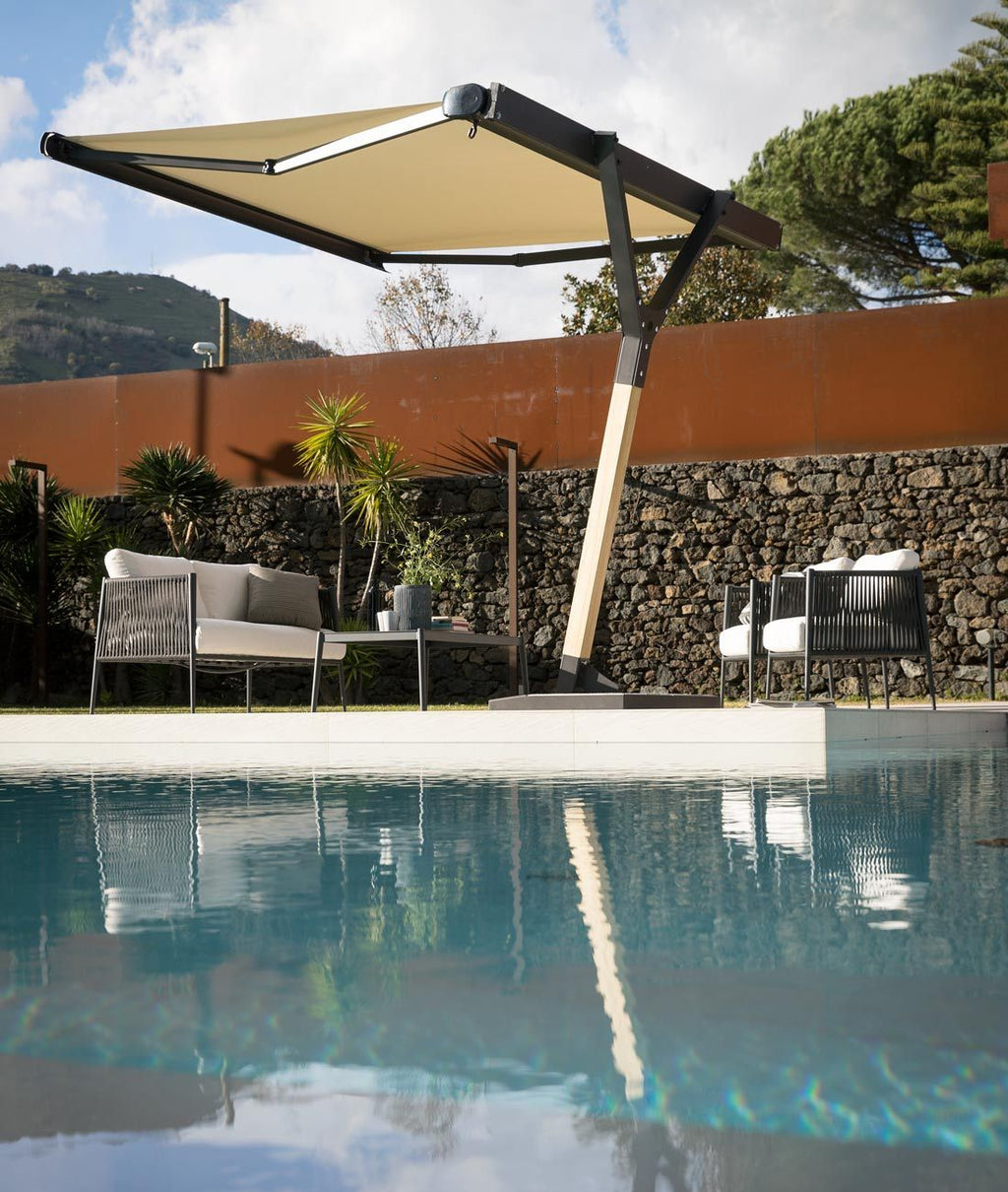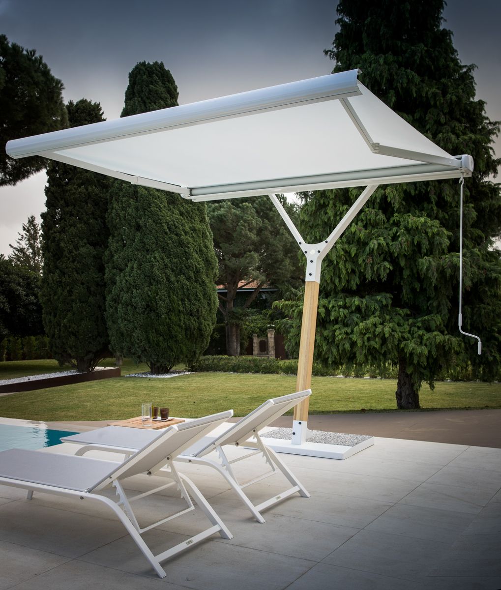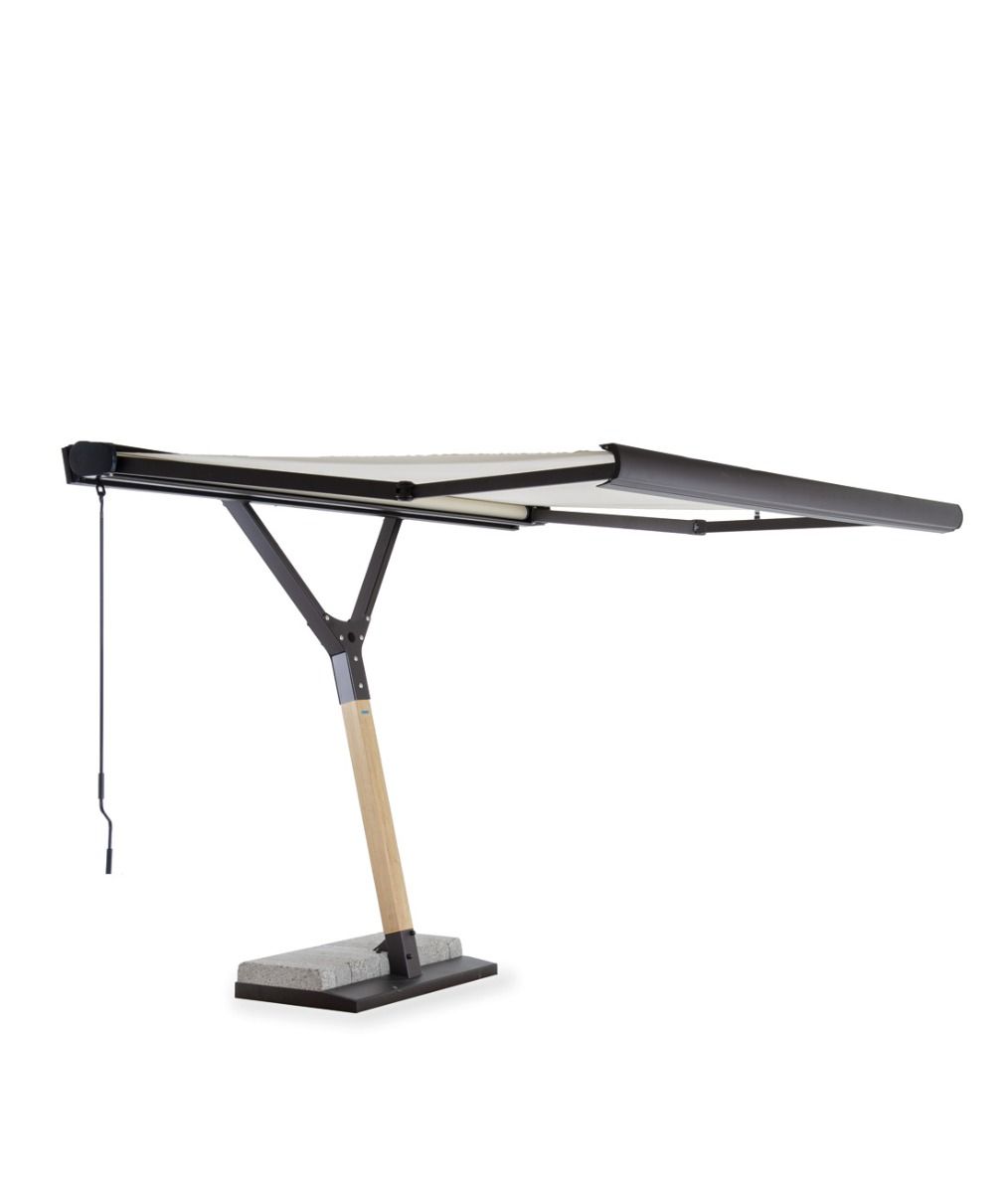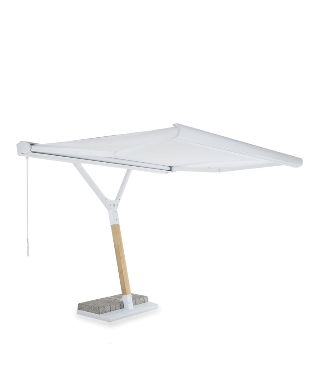 A perfect synthesis that combines the practicality of a parasol with the most up-to-date sun awning. When the awning is not in use, it is stored in a container for protection, with the advantage that the space underneath remains free. The awning tarpaulin is rolled up with a motor by remote control or manually with a hand crank and cable pull.