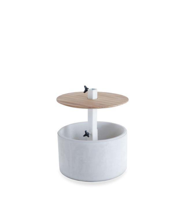 The new round LIPARI umbrella stand ( Design Studio Adolini ). concrete with table made of precious I roko wood that can be adjusted in four positions,