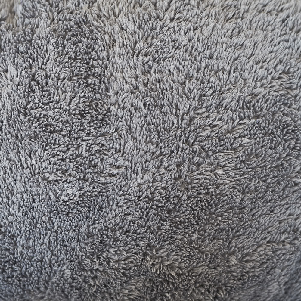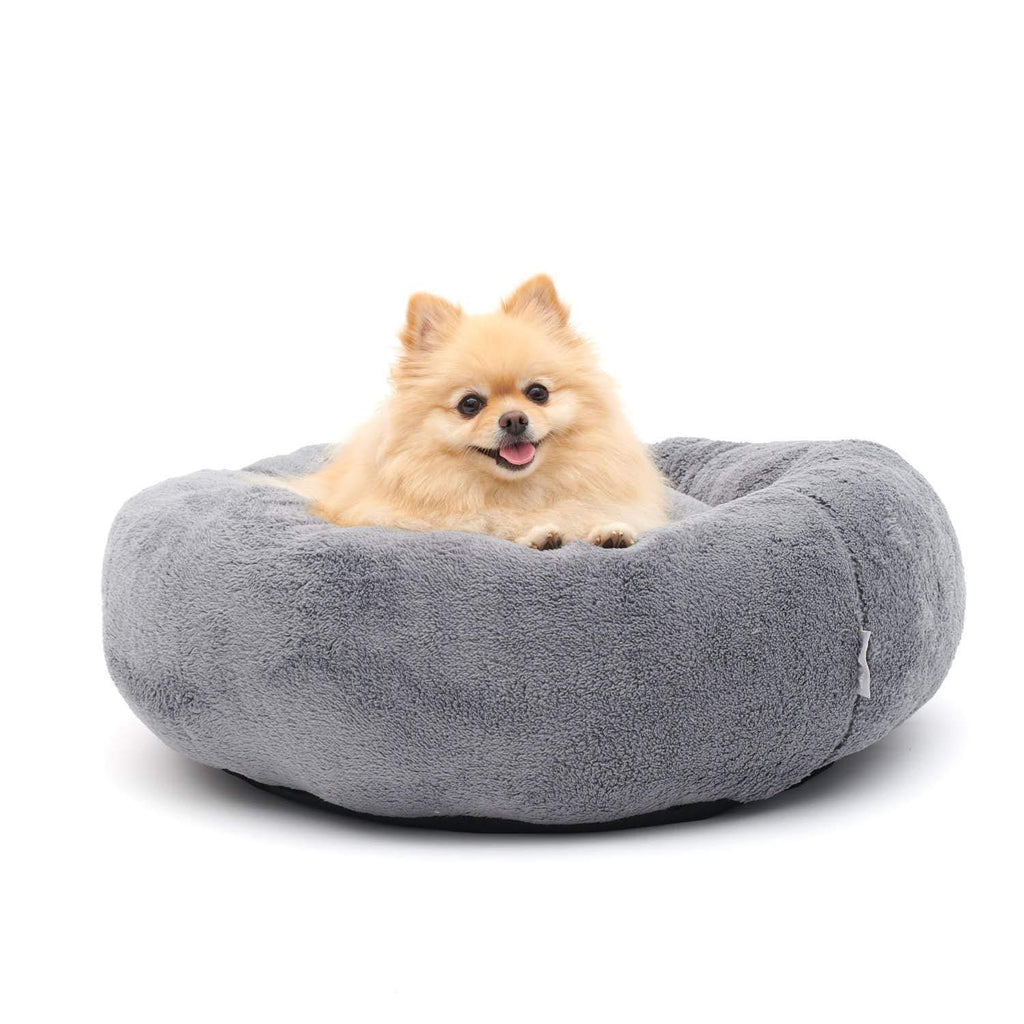 It doesn't matter whether it's a cat, dog or human, the security provided by the round shape seems tangible - a perfect place to sleep, cuddle and dream. The soft, gray faux fur plush stretches across the entire dog bed.