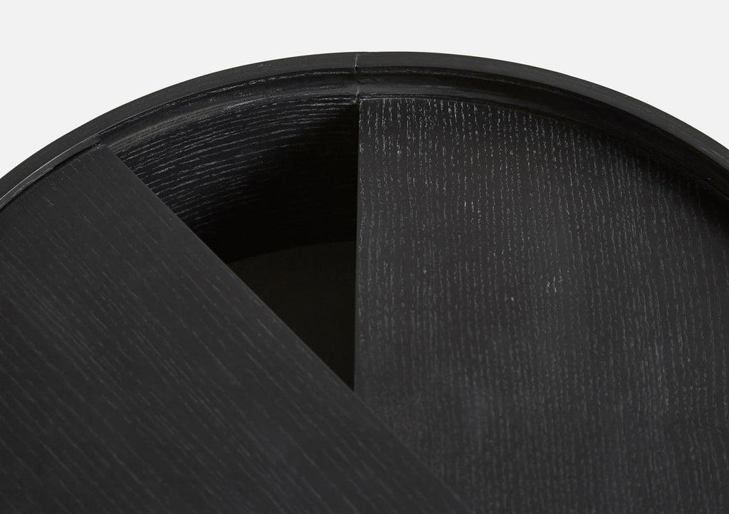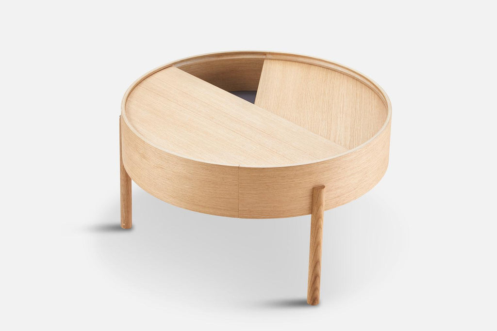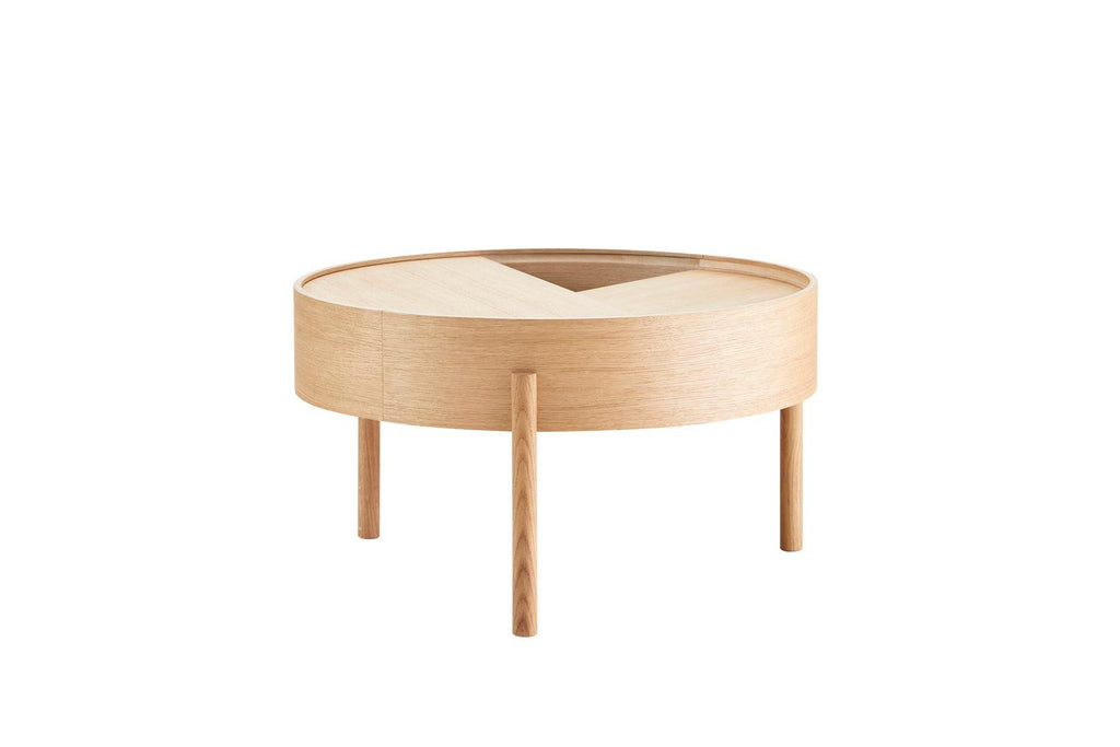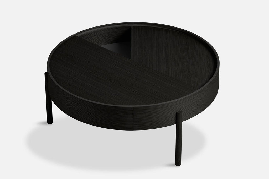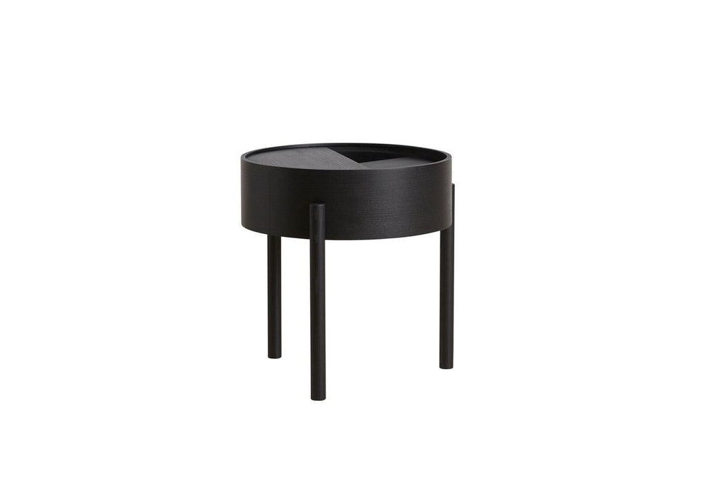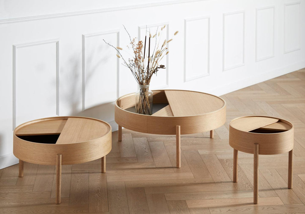 You can choose from a selection of colors such as ash wood (white pigmented or black), walnut wood (natural/dark brown) or oak (natural/light brown). The design of the table can be changed at any time by turning one half of the round lid. The surface of the interior is covered with a smooth nanolaminate to complement the ash wood. Inside you can easily store items such as books and TV remote controls.
