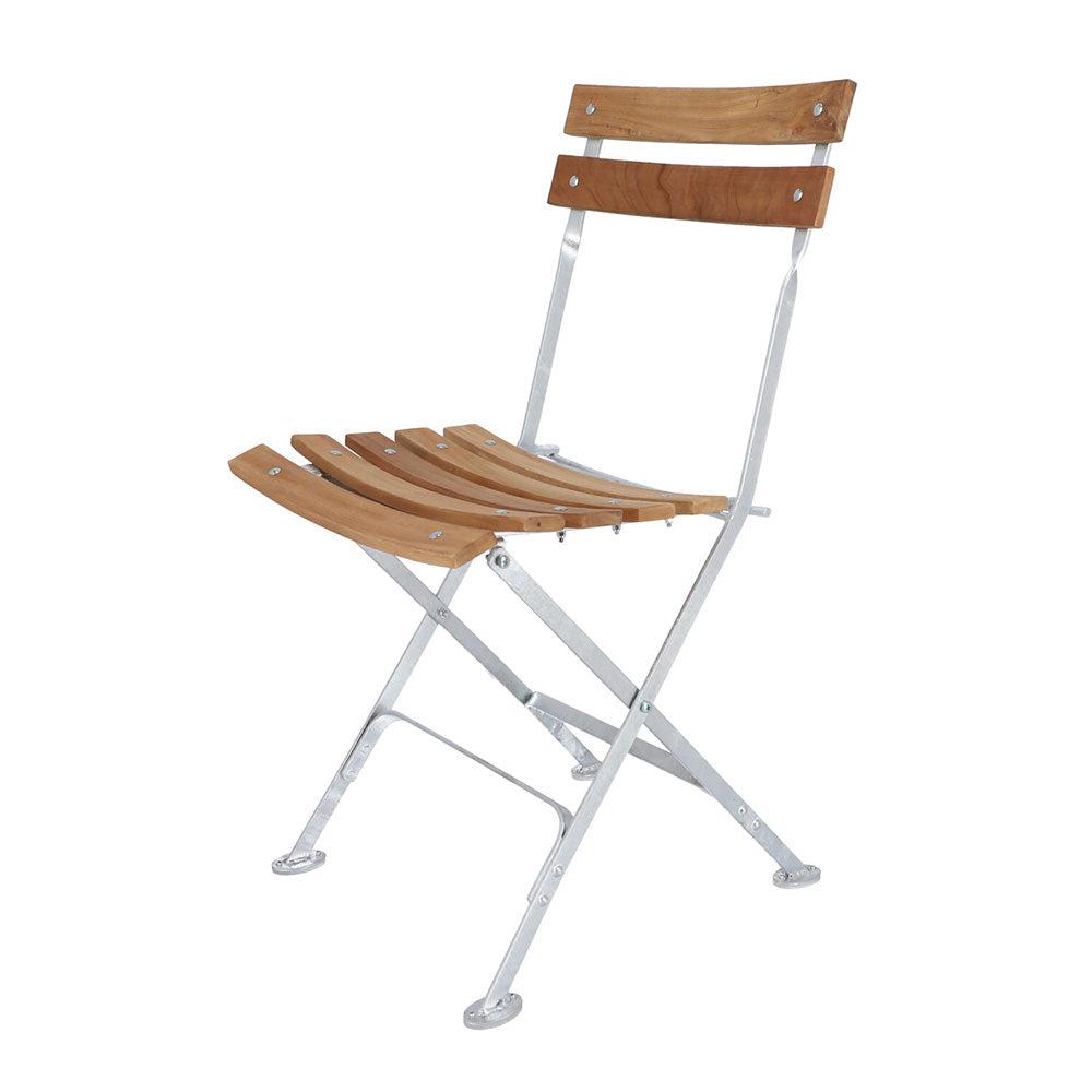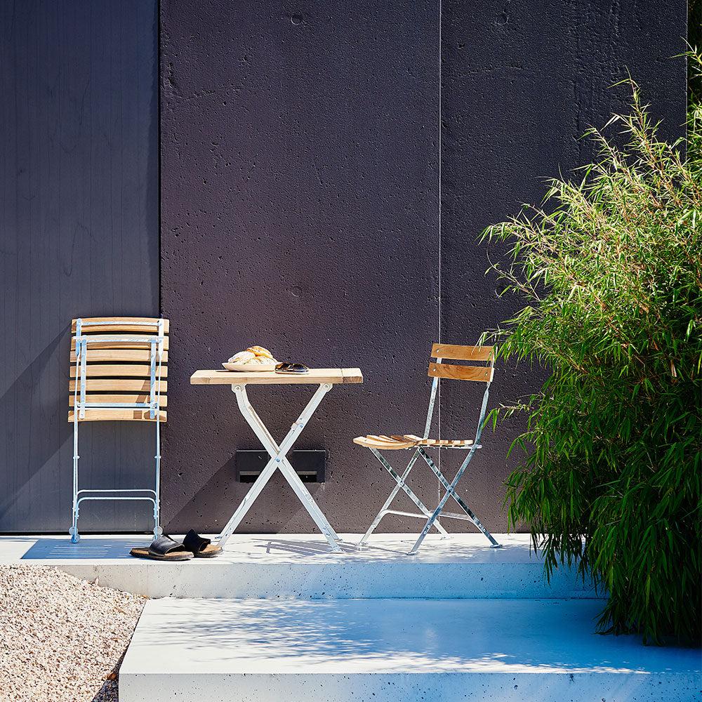 Gestell: Stahl, feuerverzinkt; Lattung: Teakleisten, natur