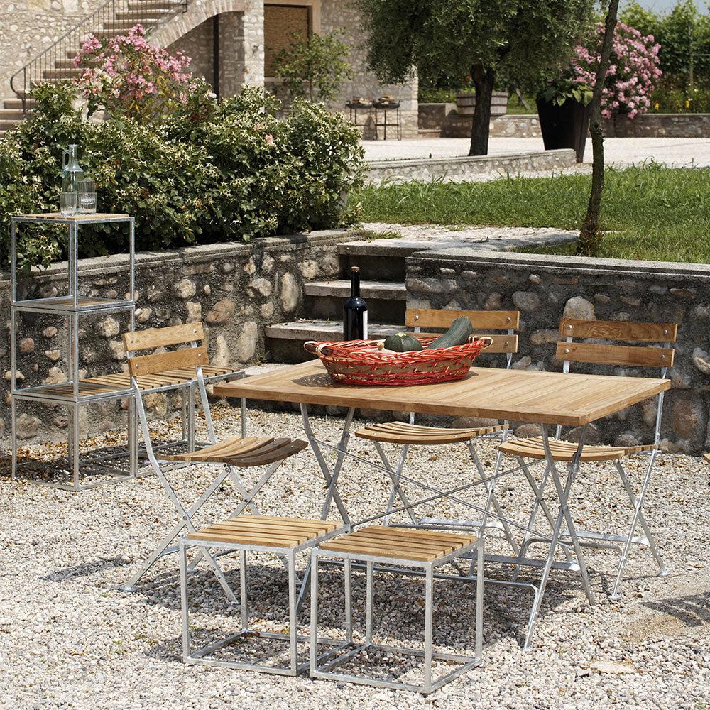 Gestell: Stahl, feuerverzinkt; Lattung: Teakleisten, natur