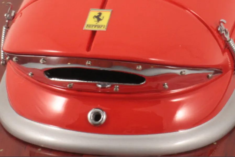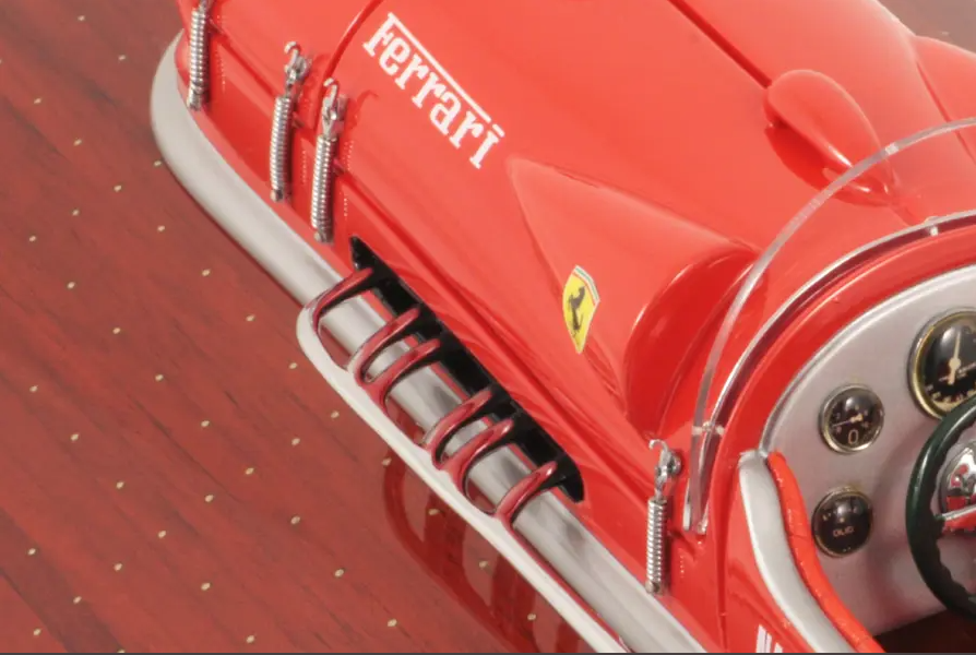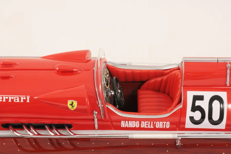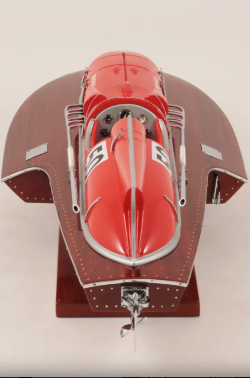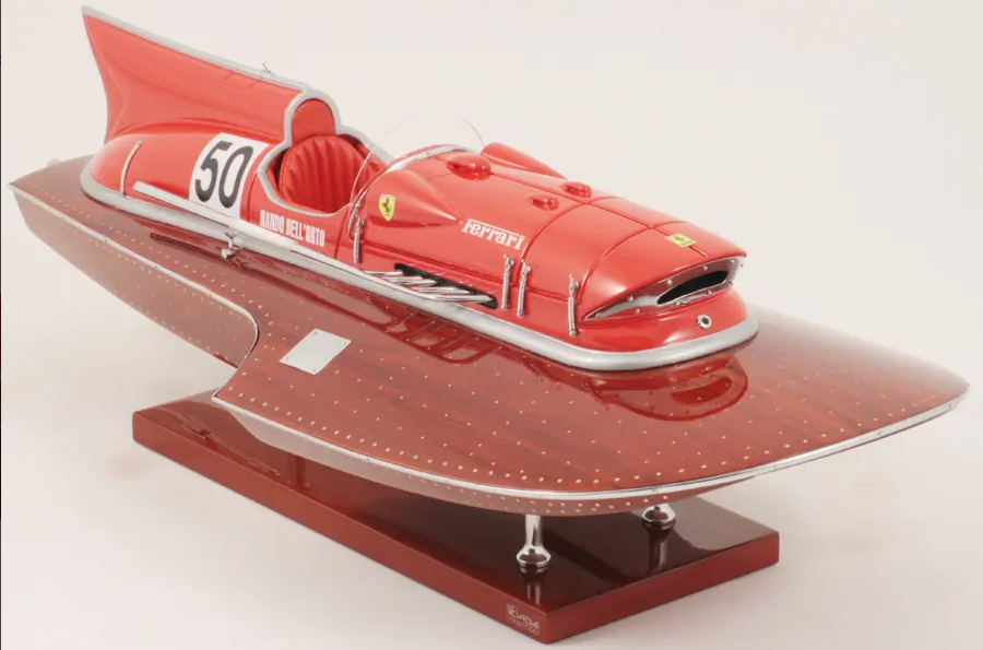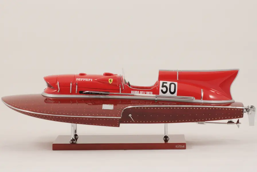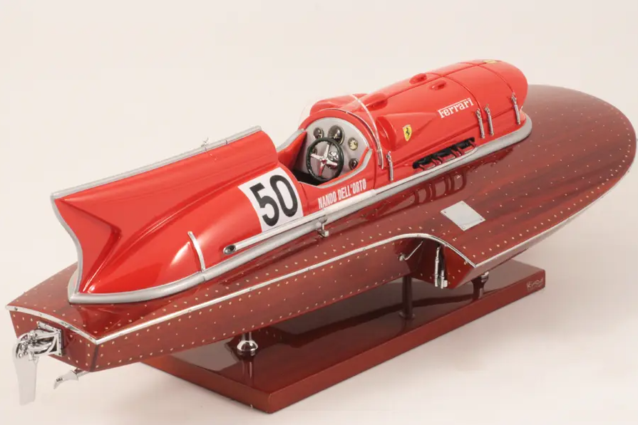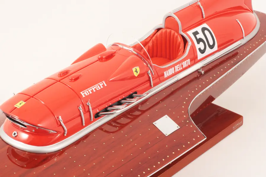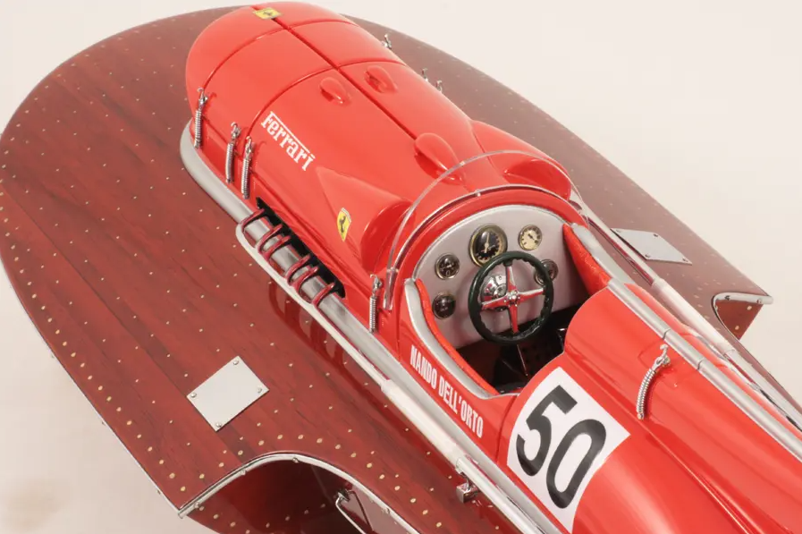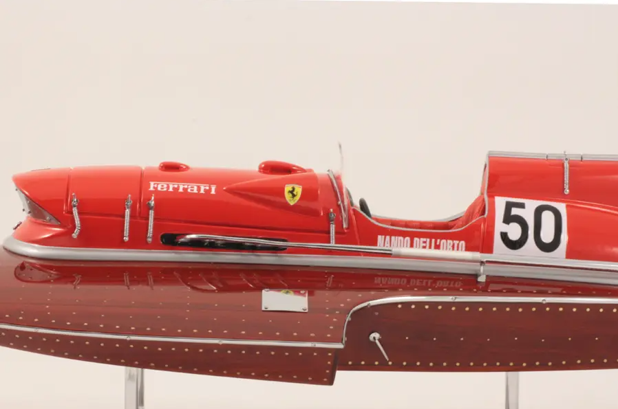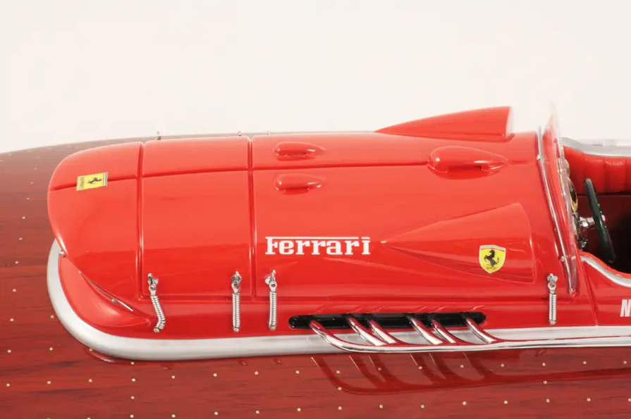 Echtes Ausnahmeobjekt, dieses Modell Arno XI (Ferrari-Motor) mit einer Länge von 50 cm wurde im Maßstab 1:12 gefertigt. Nachbau des legendären Rennbootes, dieses Modell wird vollständig von Hand aus edlen Materialien hergestellt: Holz (Buchenholz), Marinepolster. Alle Beschlagteile sind in verchromtem Messing von Juwelieren gefertigt. 10 Lackschichten werden aufgetragen, um einen hervorragenden Lackglanz zu erzielen.