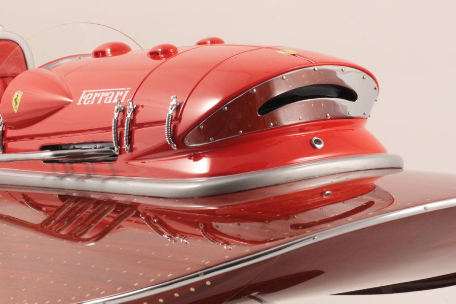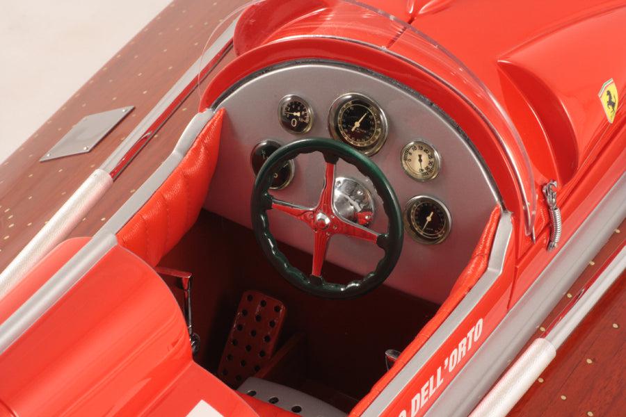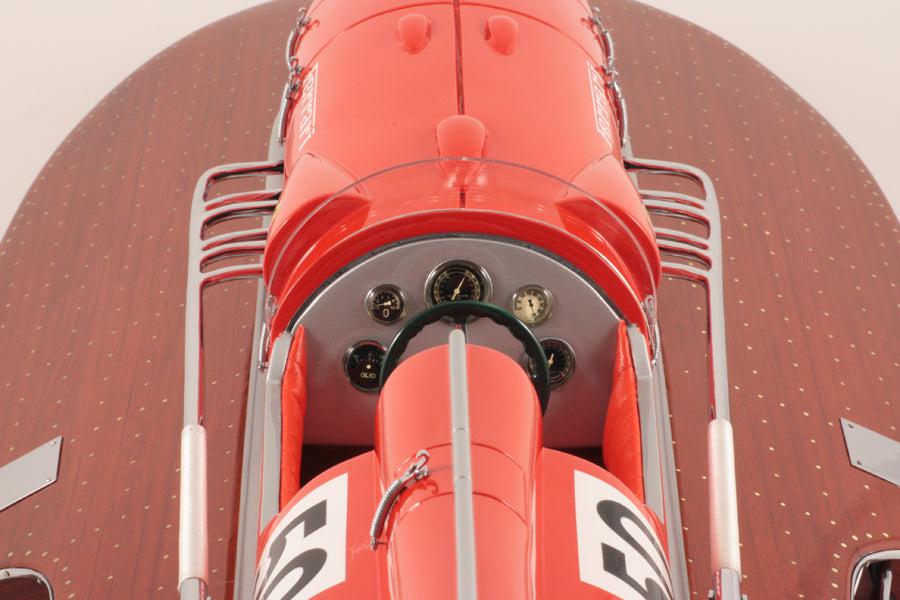 Dieses Ausnahmemodell des Arno XI (ausgestattet mit Ferrari-Motor), mit einer Länge von 91 cm, wurde im Maßstab 1:7 gefertigt. Nachbau des legendären Rennbootes, dieses Modell wird vollständig von Hand aus edlen Materialien hergestellt: Holz (Buchenholz), Marinepolster. Alle Beschlagteile sind in verchromtem Messing von Juwelieren gefertigt. 10 Lackschichten werden aufgetragen, um einen hervorragenden Lackglanz zu erzielen.