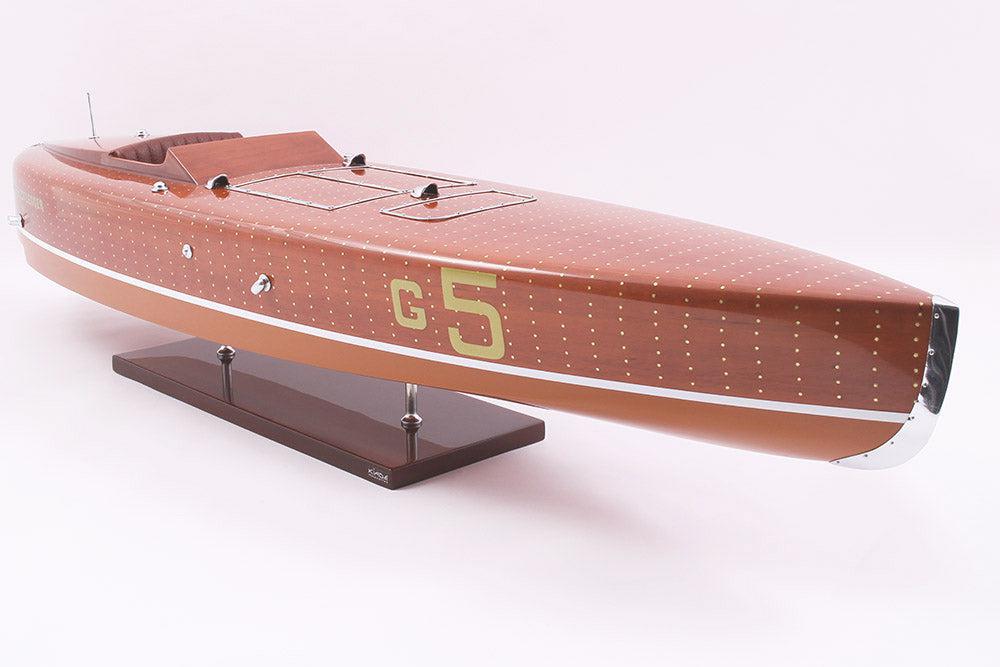 Dieses Modellboot Babybootlegger mit einer Länge von 85 cm wurde im Maßstab 1:10 gefertigt. Nachbildung des legendären Bootes, dieses Modell wird vollständig von Hand aus edlen Materialien hergestellt: Holz (Buchenholz), Marinepolster. Alle Beschlagteile sind in verchromtem Messing von Juwelieren gefertigt. 10 Lackschichten werden aufgetragen, um einen hervorragenden Lackglanz zu erzielen.