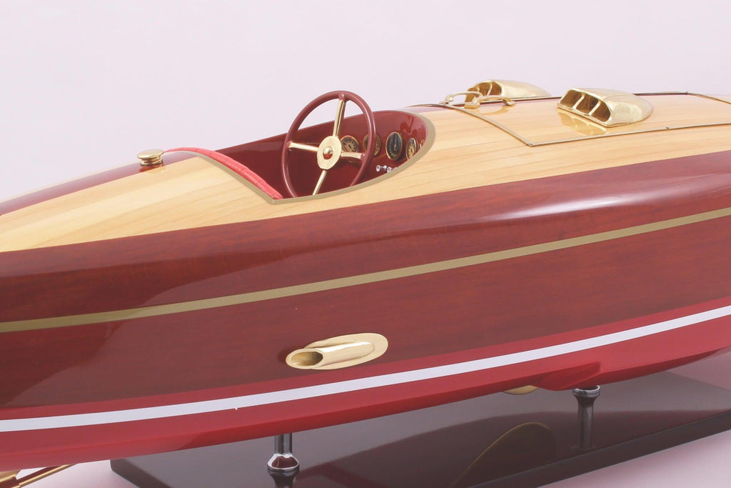 Dieses Modellboot Flyer mit einer Länge von 82 cm ist eine Nachbildung des legendären Bootes. Dieses Modell ist komplett von Hand aus edlen Materialien gefertigt: Holz (Buchenholz), Marinepolsterung. Alle Beschlagteile sind in verchromtem Messing von Juwelieren gefertigt. 10 Lackschichten werden aufgetragen, um einen hervorragenden Lackglanz zu erzielen.
