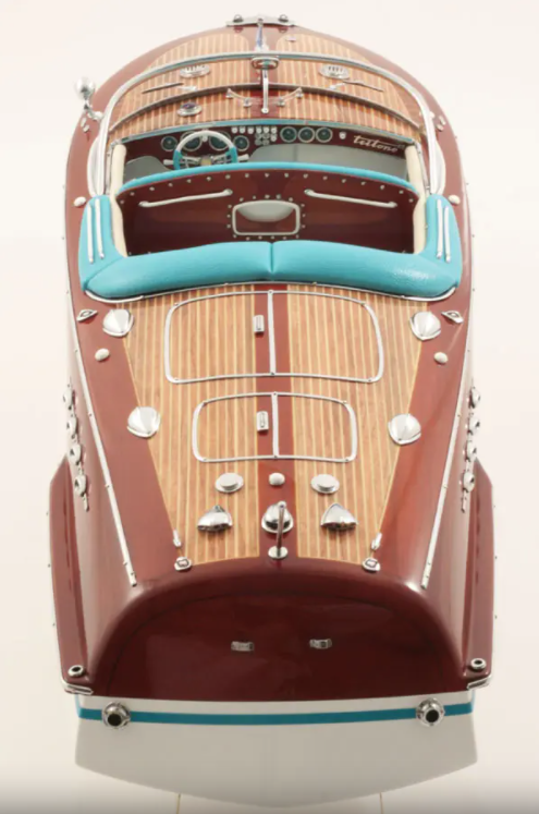 Dieses offizielle Modellboot von Riva Super Tritone (Maßstab 1:15) wird aus hochwertigem Holz (Buchenholz) und mit passenden Teilen (Chrommessing) von unseren Juwelieren gebaut. Echte Polsterung.