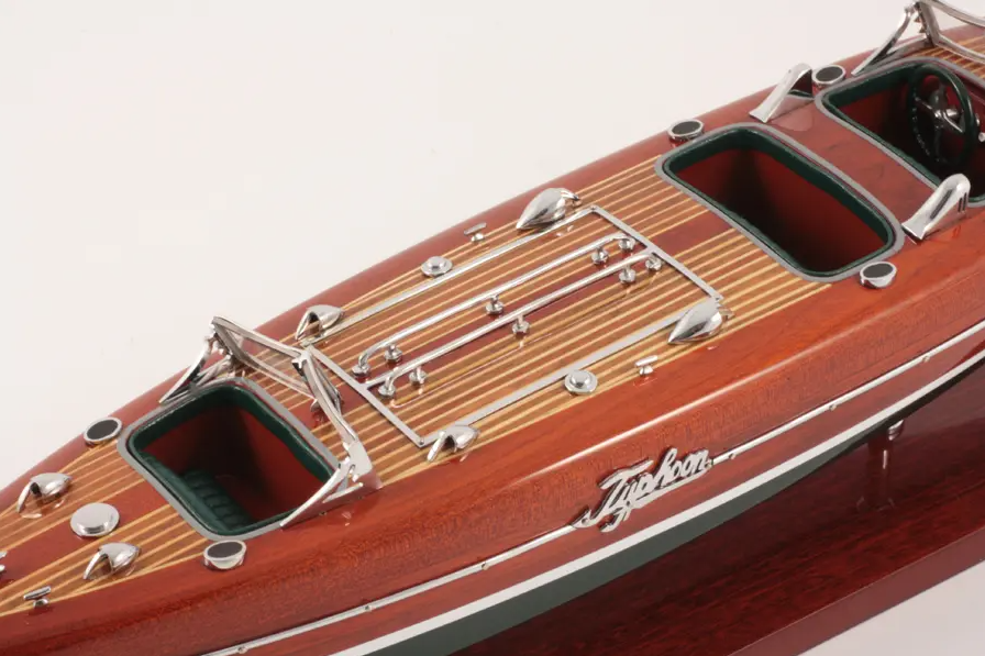 Dieses Modellboot Typhoon mit einer Länge von 50 cm ist eine Nachbildung des legendären Bootes. Dieses Modell wird vollständig von Hand aus edlen Materialien hergestellt: Holz (Buchenholz), Marinepolsterung. Alle Beschlagteile sind in verchromtem Messing von Juwelieren gefertigt. 10 Lackschichten werden aufgetragen, um einen hervorragenden Lackglanz zu erzielen.
