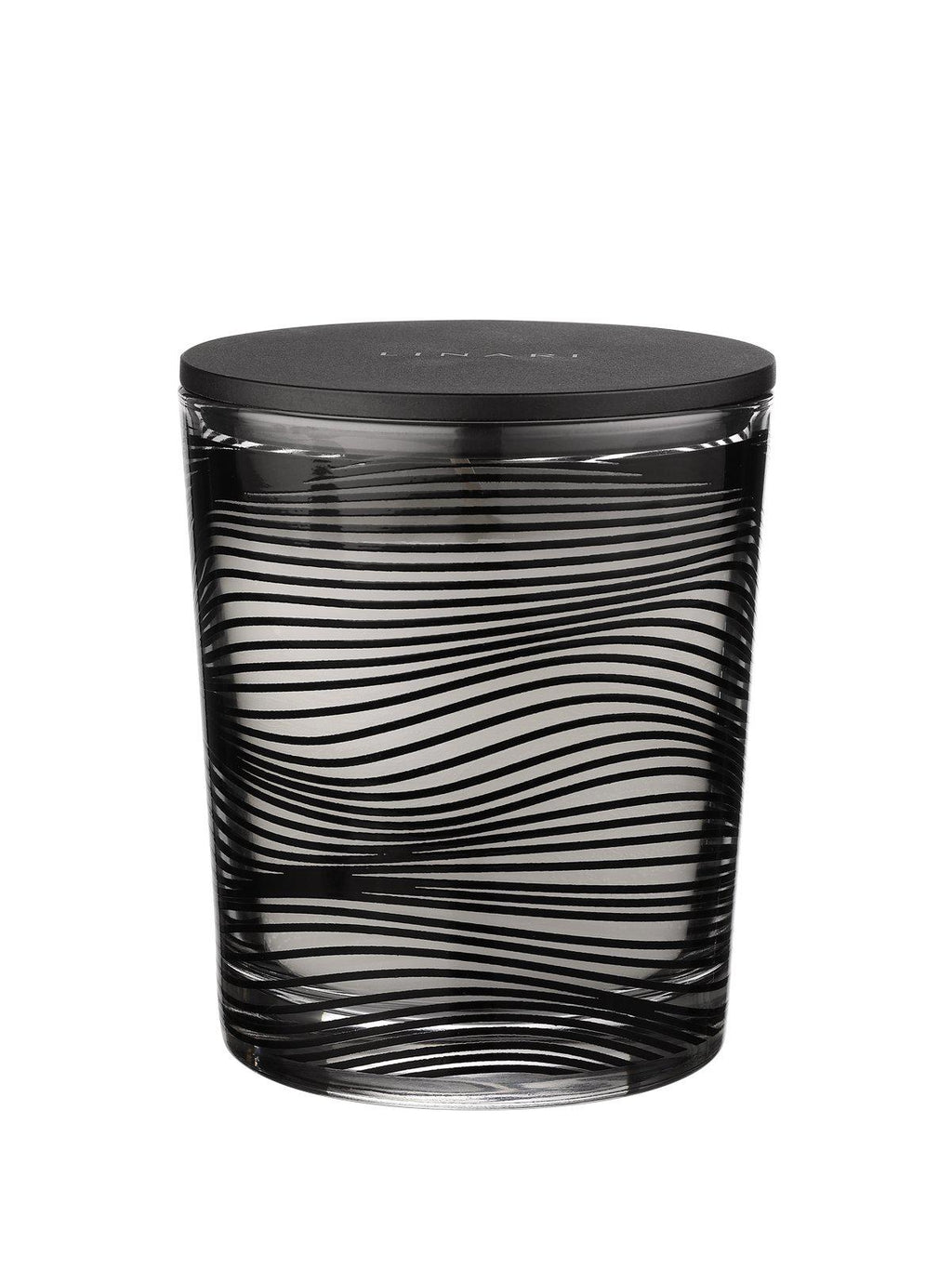 Das bestechende Design der Duftkerze LINARI-ONDA stellt einen extravaganten Meilenstein dar. Im Kontrast zur hochtransparenten Glasoberfläche steht das tiefschwarze und abstrakte Wellendekor, das das Kerzenglas organisch umschließt. Die Verwendung naturfarbenen Wachses lässt das graphische Wellendekor maximal und puristisch zur Geltung kommen. Der minimalistische, mattschwarze Deckel aus massivem Bakelit mit silberfarbenem LINARI-Logo rundet den avantgardistischen Look ab. Dieser kann dekorativ als Untersetzer für alle Kerzen- und Diffusoren von LINARI universell verwendet werden. Brenndauer bis zu 45 Stunden.